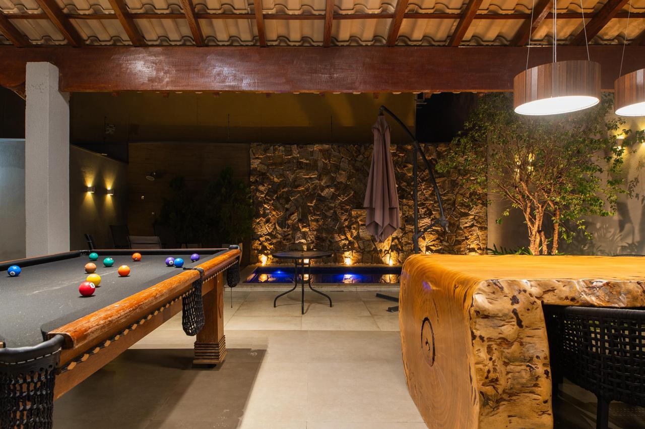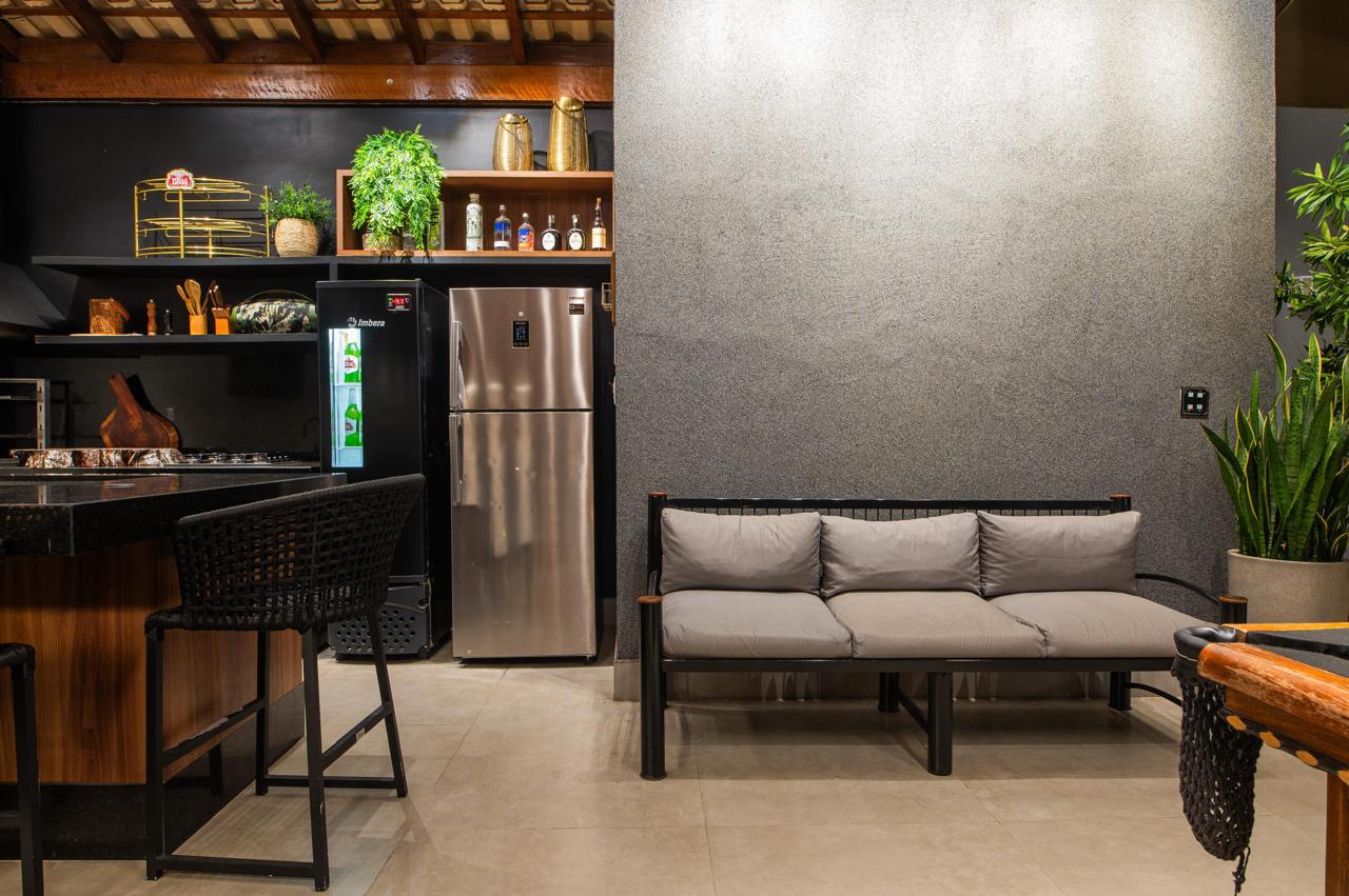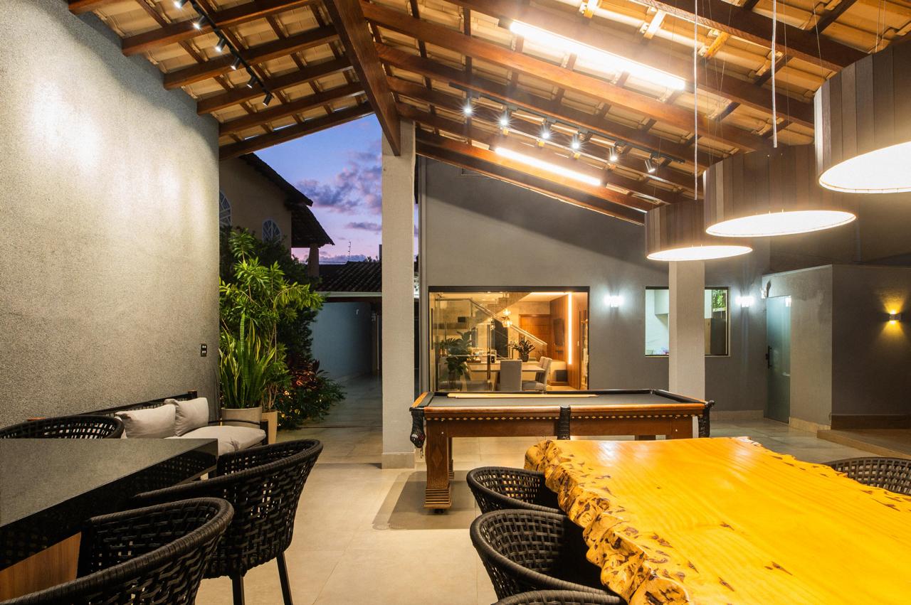 área gourmet com pé direito alto e telhado ventilado em madeira maciça