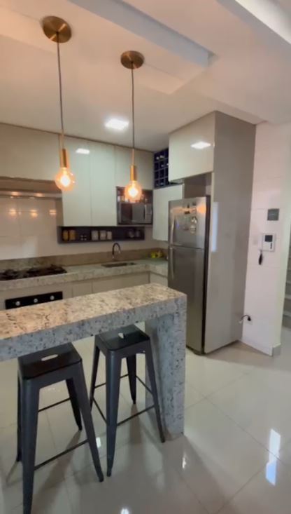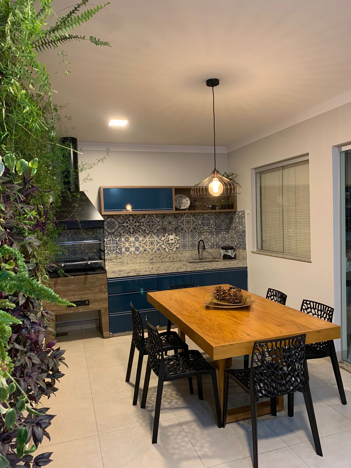 - Área gourmet integrada com espaçosos armários planejados, churrasqueira, pia, bancada, painel para TV, jardim vertical