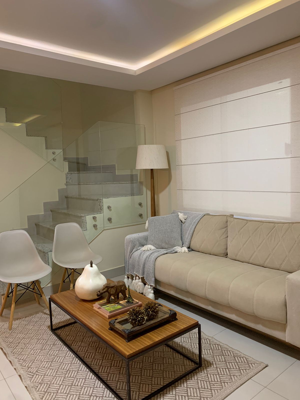 - Hall de circulação, escada com corrimão e vidro.